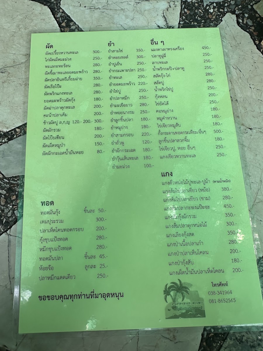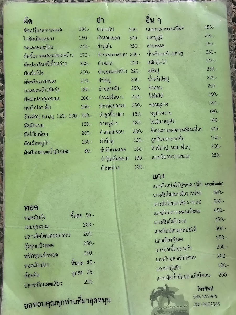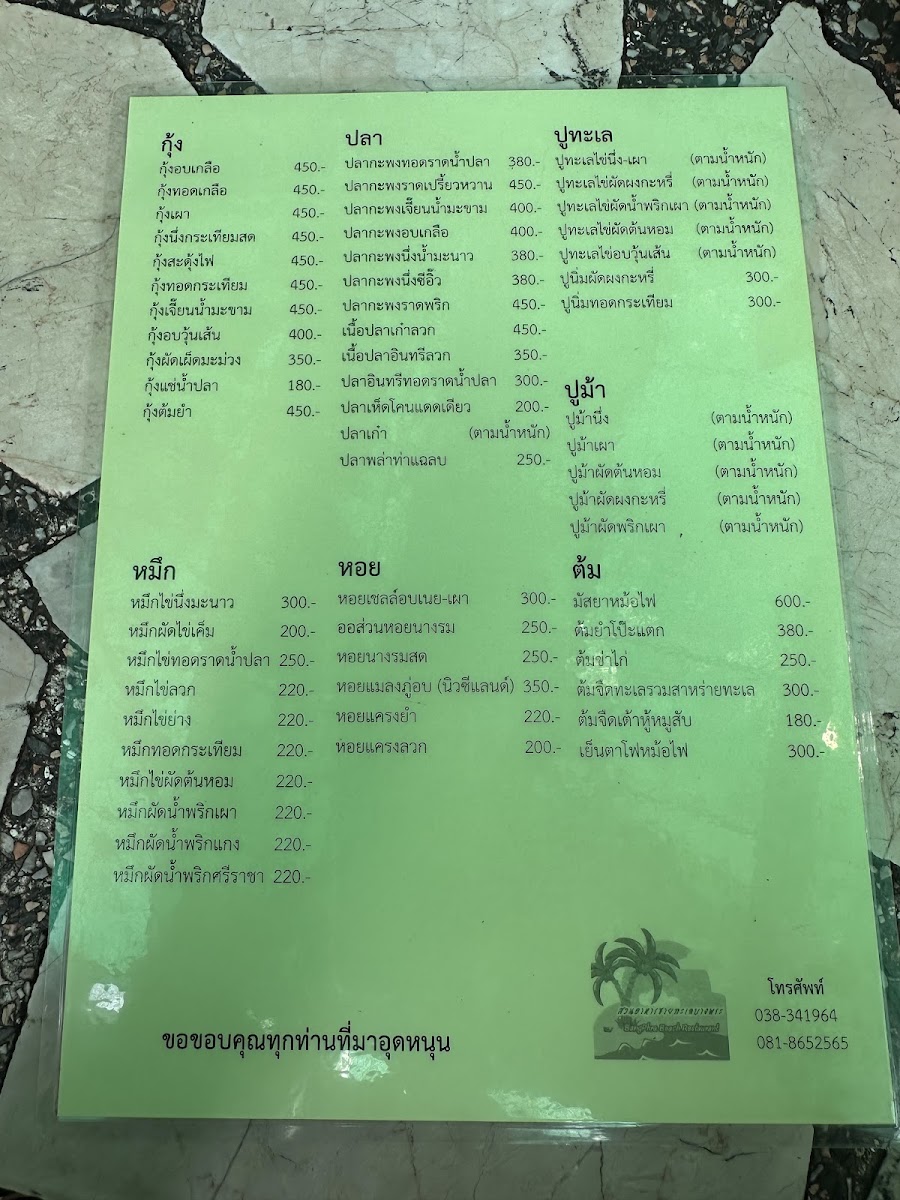 “ Great food place Cheap cheap 1k baht for 4 ppl Clean place Outdoor seating By a big park near the sea Has parking Accepts half -half ”