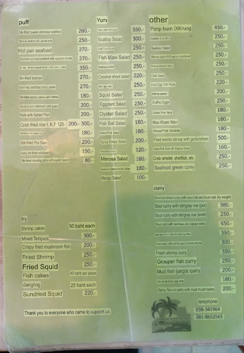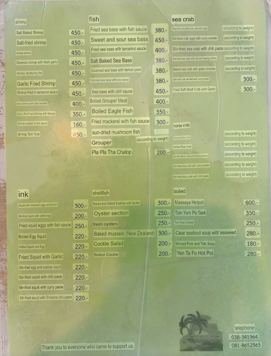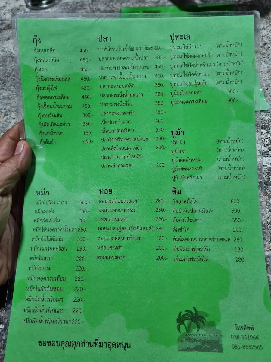 “ Great food place Cheap cheap 1k baht for 4 ppl Clean place Outdoor seating By a big park near the sea Has parking Accepts half -half ”
